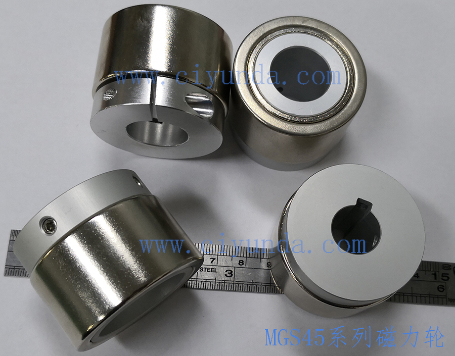 外徑45mm。是目前我公司外徑最大的直角傳動磁力輪,這個規格我們是燒結的,表面鍍鎳,10級充磁,常備內孔有30mm、25mm、20mm、15mm,其他內孔的也可以根據客戶的定做。這個規格是傳動方式為直角,如果間隙1mm時,傳動扭矩為1.2N.m。固定方式有頂絲固定和夾緊固定,目前有常備庫存。型號為:MGS4510P-20AC、MGS4510P-15AC、MGS4510P-25AC等